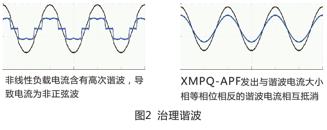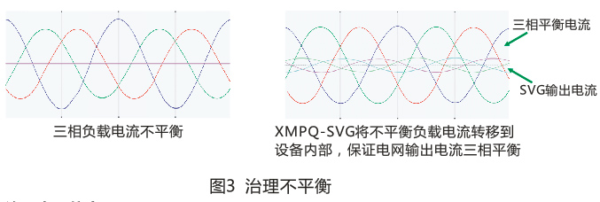 有源濾波器(APF)補(bǔ)償2-50次諧波,靜止無功發(fā)生器(SVG)補(bǔ)償無功、三相電流不平衡、以及13次以內(nèi)低次諧波。